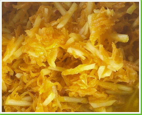 Karotten mit der feinen Reibe reiben. Wichtig, da nur so der sehr gesunde Saft austritt.